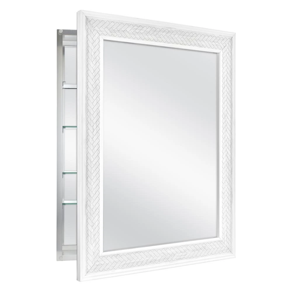 The Home Decorators Collection 24 in. W x 30 in. H x 4.85 in. D Fog Free Framed Marble Herringbone Medicine Cabinet gives you a fogless reflection you’ve always dreams of. Our innovative, fog-free technology is safe, affordable and does not require heating elements. You can finally enjoy a fog-free view after a steamy shower. This medicine cabinet can be recessed or surface mounted. Includes side mirrors and hardware for optional surface mount feature. Use the two double shelf pegs for quick and easy customized storage space along with the 3 adjustable glass shelves. Also included are 3 removable bins for even more storage that are dishwasher safe. The door opens 165° allow for optimal usage of the interior door and back mirror for multiple viewing angles for added functionality. The durable rust-free aluminum frame is exceptionally strong and the mirror is already assembled for your convenience. The EZ-cam hanging system allows you to securely install your medicine cabinet with the included hardware and hanging instructions. The versatility of this cabinet also allows the door to be reversible to open left or right based on your preference. The herringbone design can easily coordinate with any existing bathroom hardware.