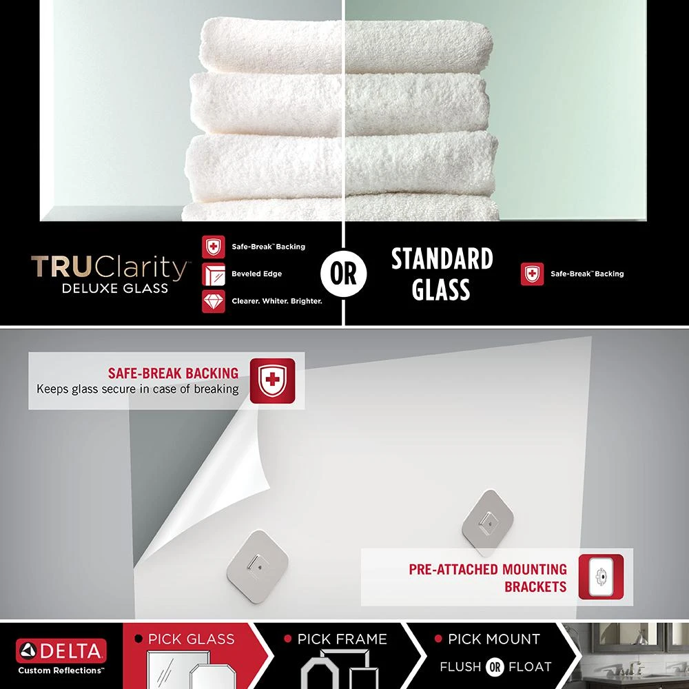 Customizing your bathroom mirror is easier and more affordable than ever with Delta Custom Reflections. Simply select your favorite size, shape, style and finish. Create the decorative vanity mirror you’ve always wanted designed by you. This TRUClarity Deluxe glass mirror features a 1 in. beveled edge and Safe-Break Backing a full coverage backing that keeps glass secure in case of breakage. The Easy-Cleat mounting system is easy-to-adjust and enables you to slide left or right to center your mirror. The float mount hardware mounts your mirror closer to you for a unique and stylish look. Customize, don’t compromise.