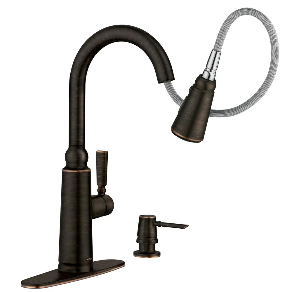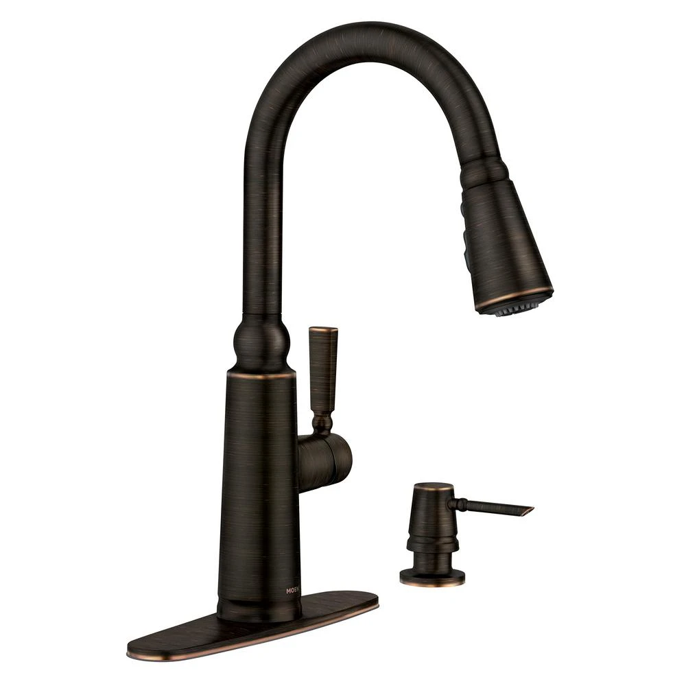 Unique decorative touches and intricate design details give the Coretta pulldown kitchen faucet a sophisticated feel. The faucet features MOEN’s Power Boost technology, which provides a faster clean and a faster fill with the push of a button, while the pulldown hose offers the Reflex system for smooth operation and secure docking of the spray wand. Coretta also offers a matching soap dispenser for fully coordinated convenience. Available in a Mediterranean Bronze finish.