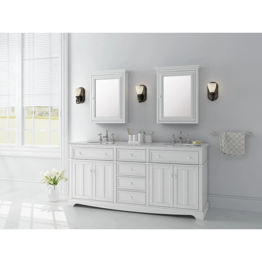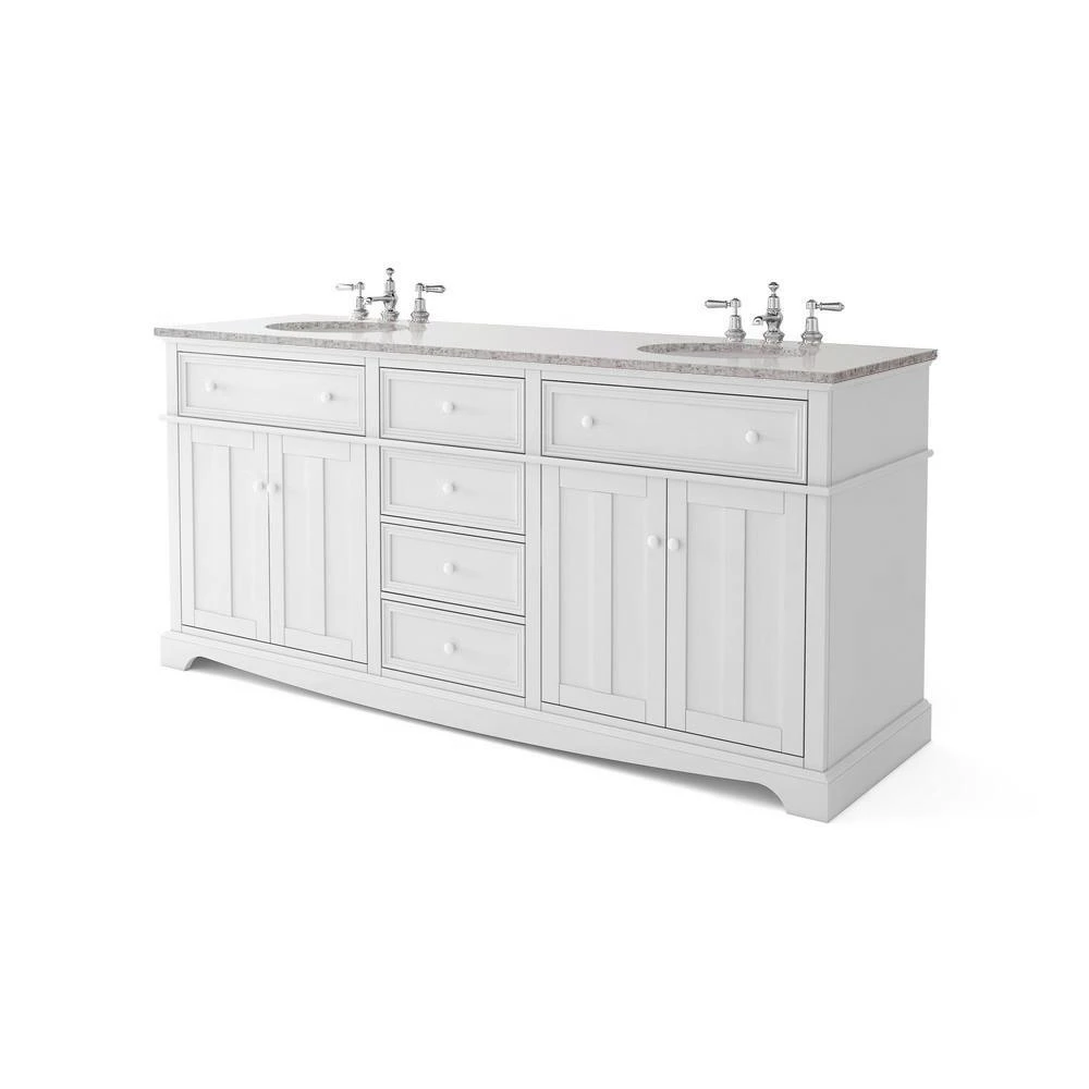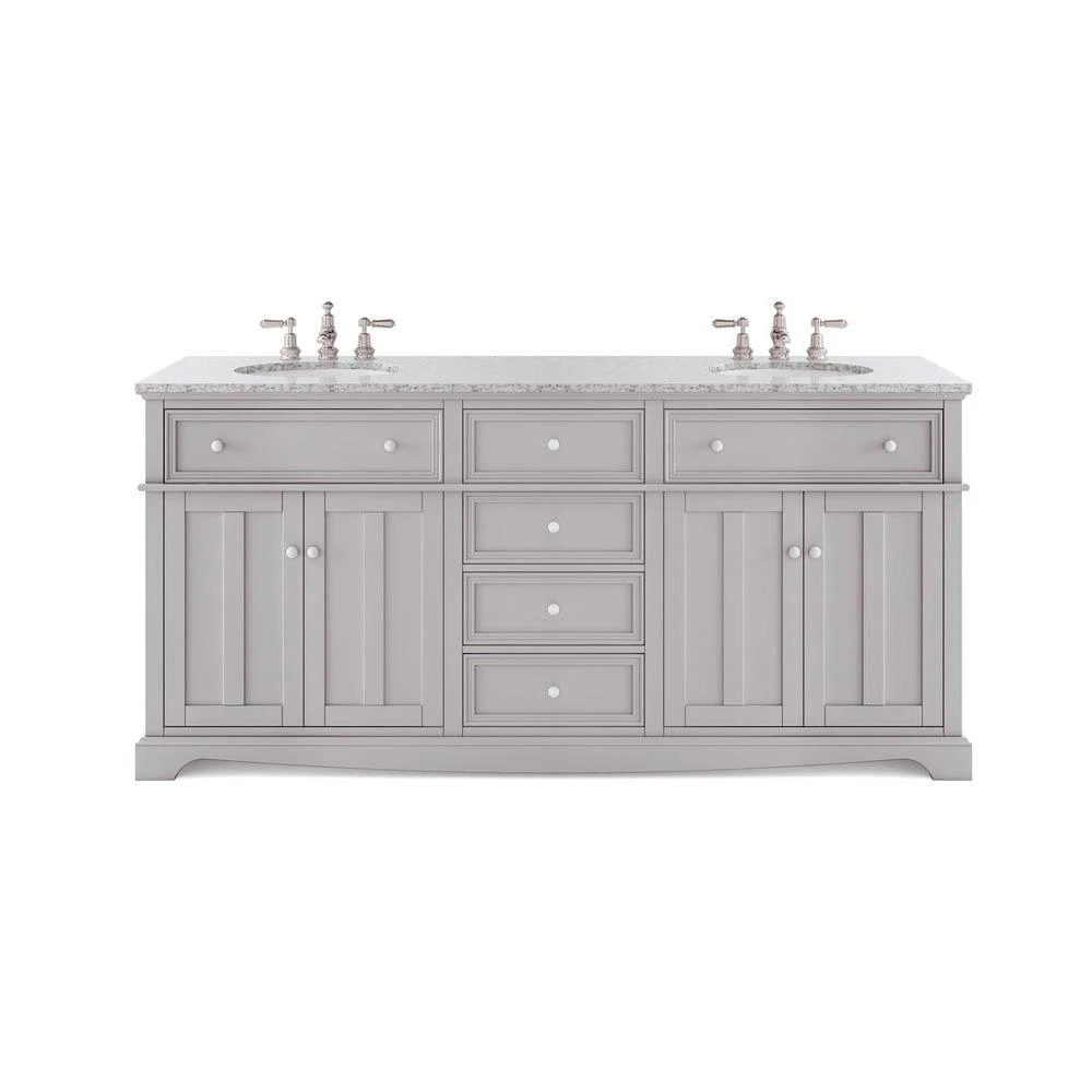 With 4 drawers and 2 under-sink cabinets, our Fremont Double Vanity offers plenty of morning prep space for 2. Each drawer is framed in slim, elegant molding. Crown and foot molding sets off the double recessed panels of each door. A gently curved toe kick runs the length of the bath vanity. This fresh, transitional design is capped off by a real granite top. The top may contain swirling or veining, features that are part of the natural beauty of stone and have no effect on function or durability.