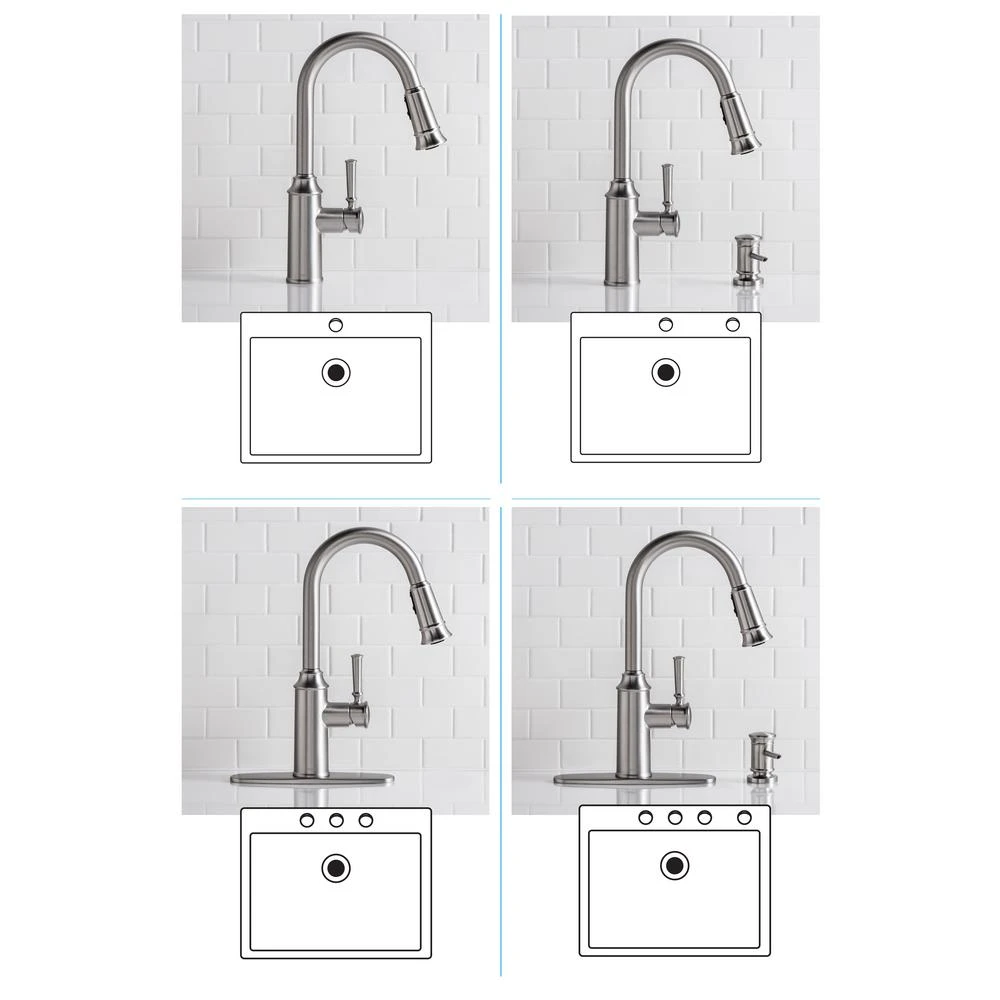 - Optional soap/lotion dispenser and deck plate included for a 1-, 2-, 3-, or 4-hole sink configuration