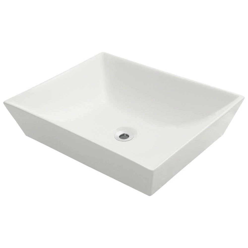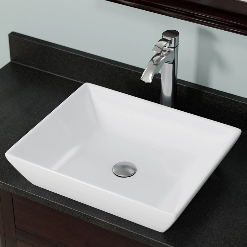 The V370-White porcelain vessel sink offers a unique, modern look for any bathroom. It is made from true vitreous China, which is triple glazed and triple fired to ensure your sink is durable and strong. Because this sink is a vessel, no mounting hardware is needed. The overall dimensions for the V370-White are 19 5/8 in. x 16 in. x 4 1/2 in. and a 21 in. minimum cabinet size is required. Vessel sinks require a special spring-loaded pop-up drain, which we offer in a variety of finishes to fit your decor. As always, our porcelain sinks are covered under a limited lifetime warranty for as long as you own the sink.