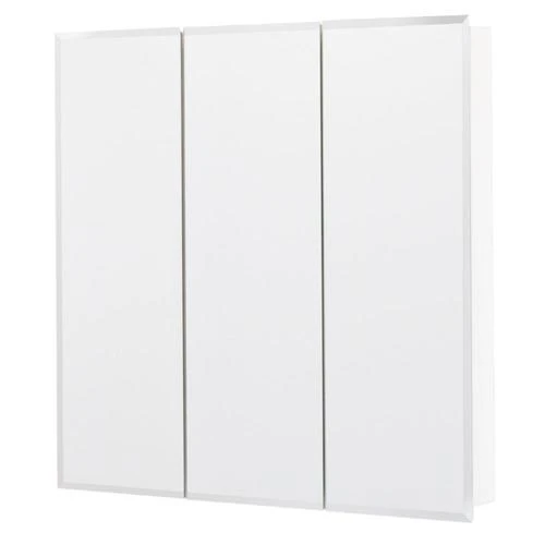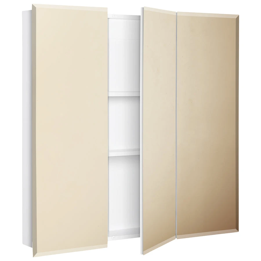 Features 2 adjustable shelves for flexible storage options and a beveled Tri-View mirrored door with adjustable concealed hinges