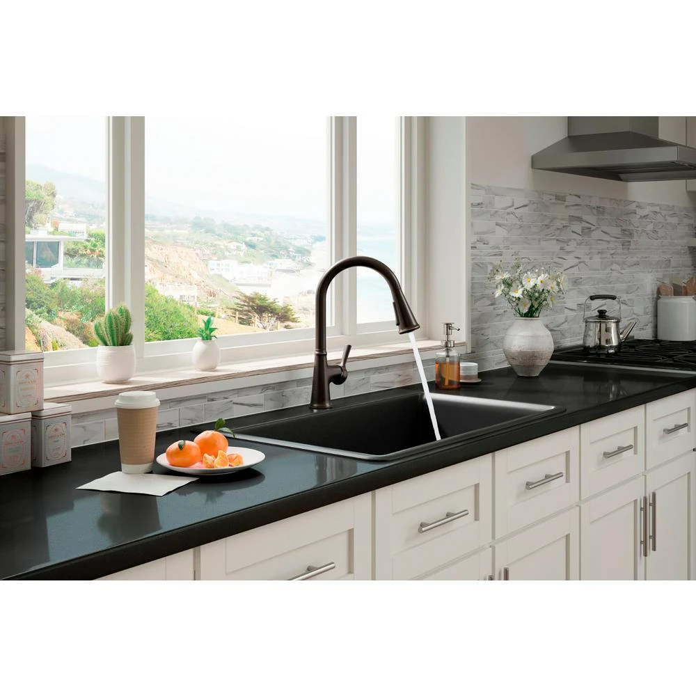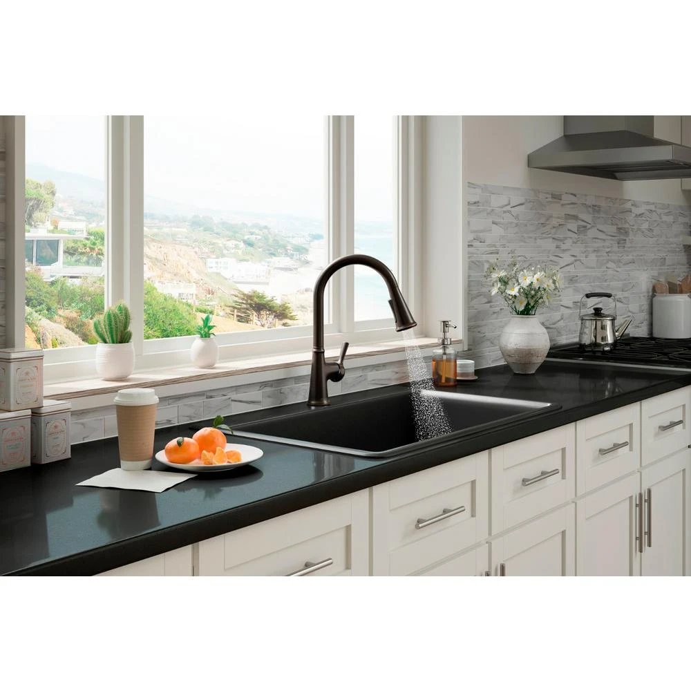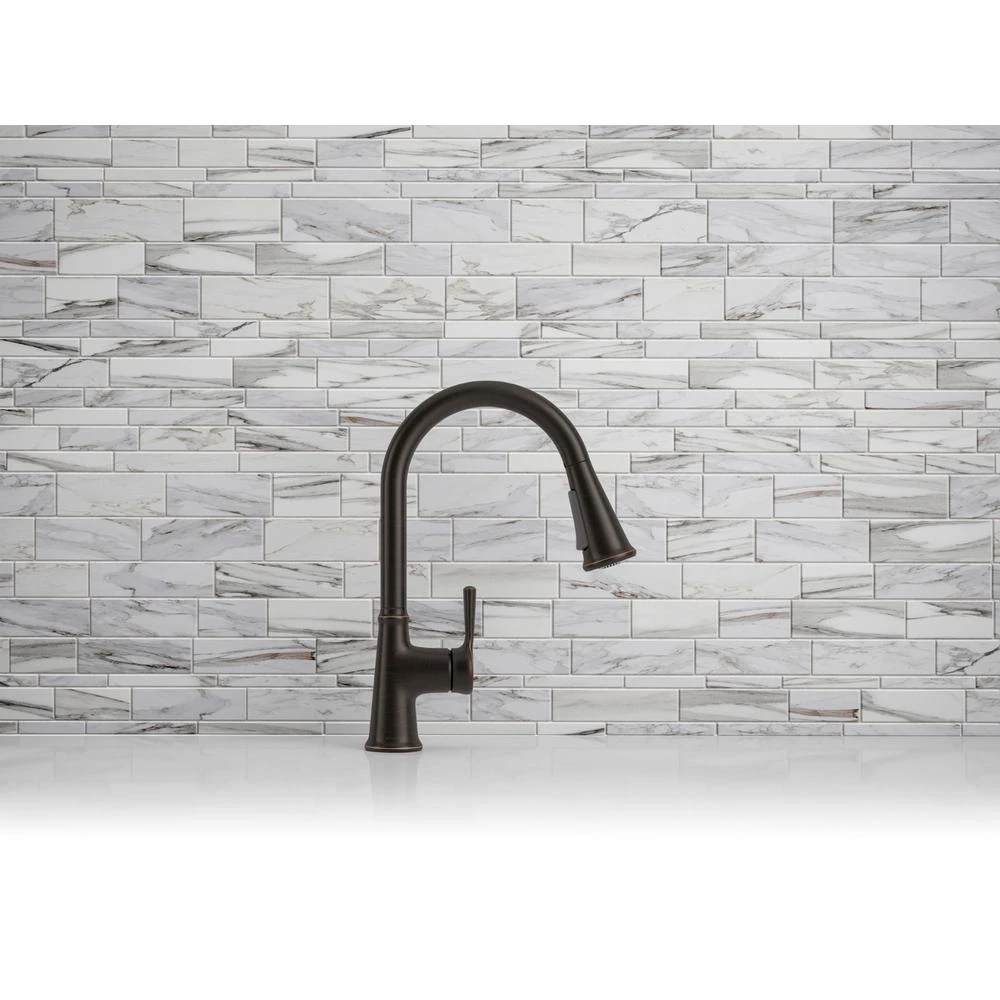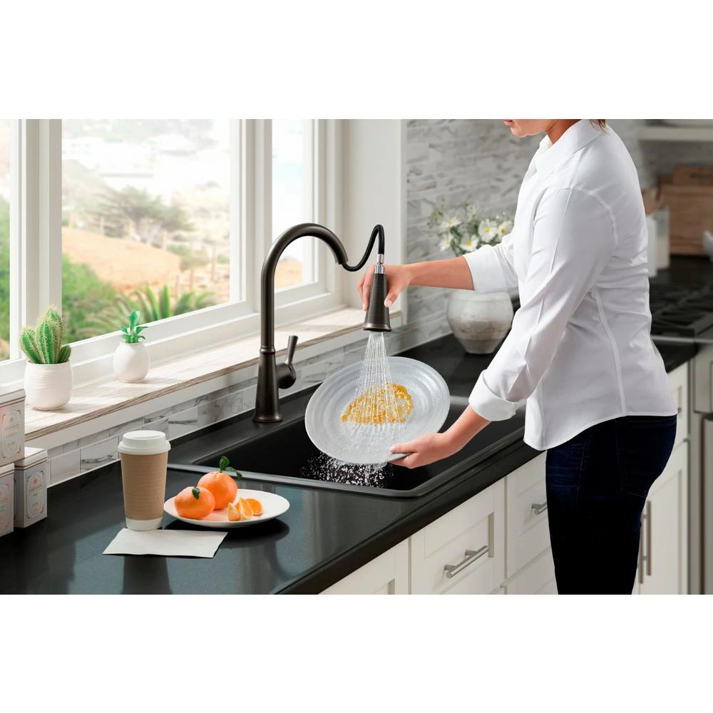 With clean lines, the Tyne kitchen faucet is a beautifully simple addition to nearly any decor. The high-arching spout easily clears pots and pans while the pull-down sprayhead featuring Sweep spray delivers a wide, forceful spray, simplifying kitchen cleanup. Pre-assembled supply hoses and quick-connect fittings make installation easy.