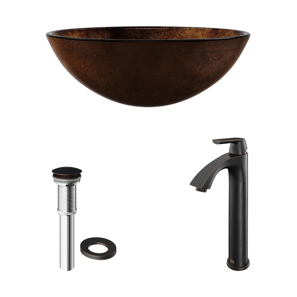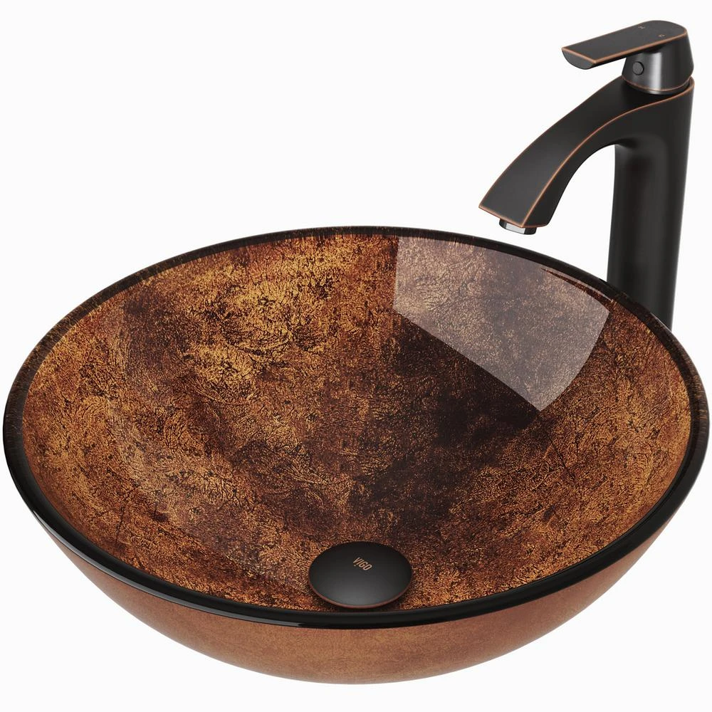Let your bathroom glisten with glamour as the VIGO Russet Glass Vessel Bathroom Sink Set with the Linus Vessel Faucet take center stage. The richly-colored, tempered glass vessel sink is as safe as it is beautiful, made to resist shards and dangerous breakage. When paired with the incredibly durable, 7-layer coated finish Linus Vessel Faucet, this sink is sure to impress all who use it. A complementary, matching pop-up drain completes this stunning set.
