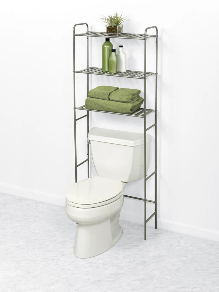 The Slat Style Spacesaver instantly adds functional storage to any bathroom by using the normally wasted space over the toilet. Unlike other bathroom storage units that typically have wire shelves, this spacesaver has three wide “slat-style” shelves that allow toiletries and other items to sit flat and steady. The spacesaver’s bottom shelf is 35 inches from the floor, so it fits over most toilets.